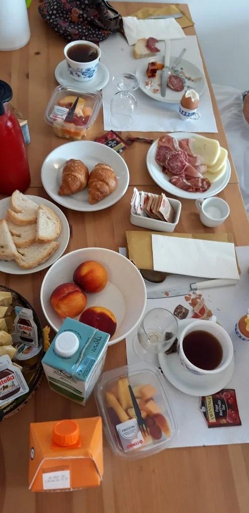 La Nostra Colazione Ogni mattina vi accogliamo con il profumo dei nostri cornetti appena sfornati, che potrete guarnire a piacere con marmellata, Nutella o miele. Per chi ama i sapori della tradizione, non mancano mai le nostre torte fatte in casa: dalla classica torta della nonna a quella di mele, fino alle crostate fragranti. Per chi preferisce il salato, offriamo pane fresco accompagnato da prosciutto cotto, crudo e una selezione di formaggi locali. Completano l'offerta fette biscottate, yogurt, succhi d'arancia rossa e frutta fresca di stagione. Attenzione alle vostre esigenze Siamo pronti ad accontentare ogni richiesta: che si tratti di intolleranze alimentari o desideri particolari, segnalatelo al momento della prenotazione o durante il soggiorno. Se desiderate uova al tegamino o omelette, saremo lieti di prepararle al momento per voi. Servizio e Comfort Il caffè, i vari tipi di tè e il latte vi verranno serviti direttamente da noi. Inoltre, l'area colazione è dotata di forno a microonde e forno tradizionale a vostra disposizione.